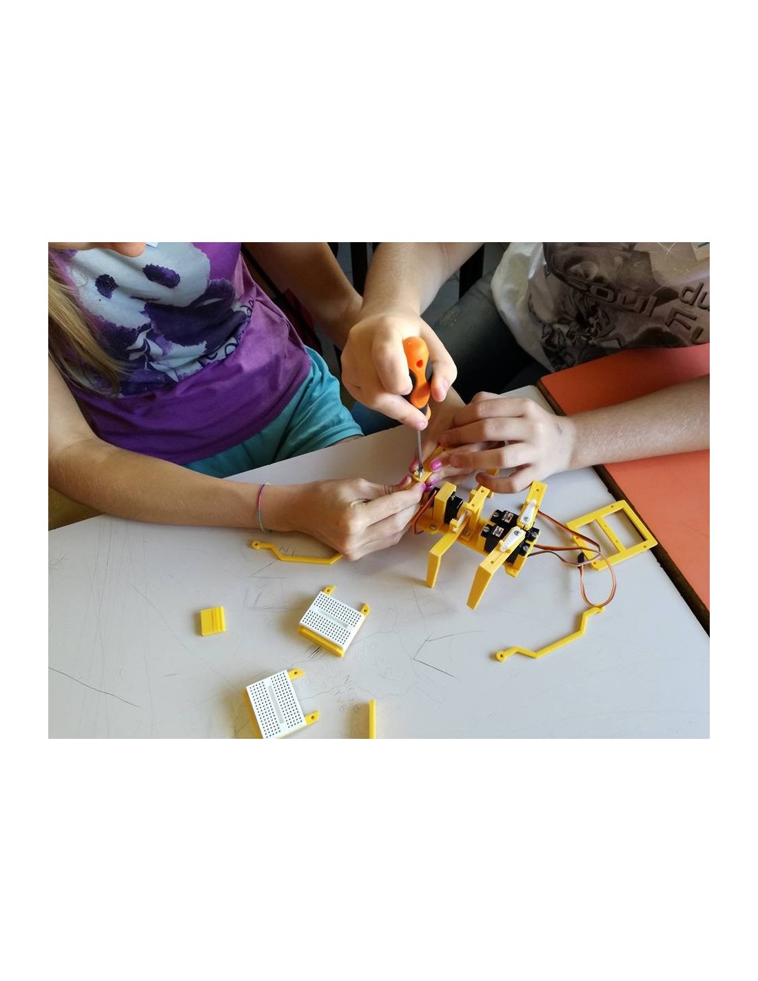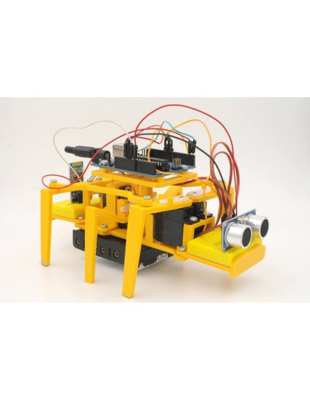 EDUino ? un robot insetto basato su tecnologia Arduino, pu? essere completamente sta mpato in 3D a scuola e consente di imparare, grazie alle lezione contenute inFABsussidiario ? Robotica creativa, i principi della programmazione base e avanzata.Supporta l'uso con App in remoto (grazie al bluetooth), sensoristica ambientale (sensori suono, ultrasuoni e luce compresi nel kit) e programmazione con Visualino, Arduino IDE e AppInventor. I componenti che costituiscono lo chassis del robot (telaio, zampe, supporto scheda etc.) saranno rilasciati in formato .stl e si troveranno all'interno della USB fornita nel kit. Dovranno essere stampati (o modificati) con le stampanti 3D in dotazione alla scuola, cost ituendo un'interessante esperienza di apprendimento dei fondamenti della stampa e della modellazione 3D. Sar? dunque possibile sostituire un componente, personalizzare alcune parti o addirittura stamparne altri esemplari riciclando l'elettronica!