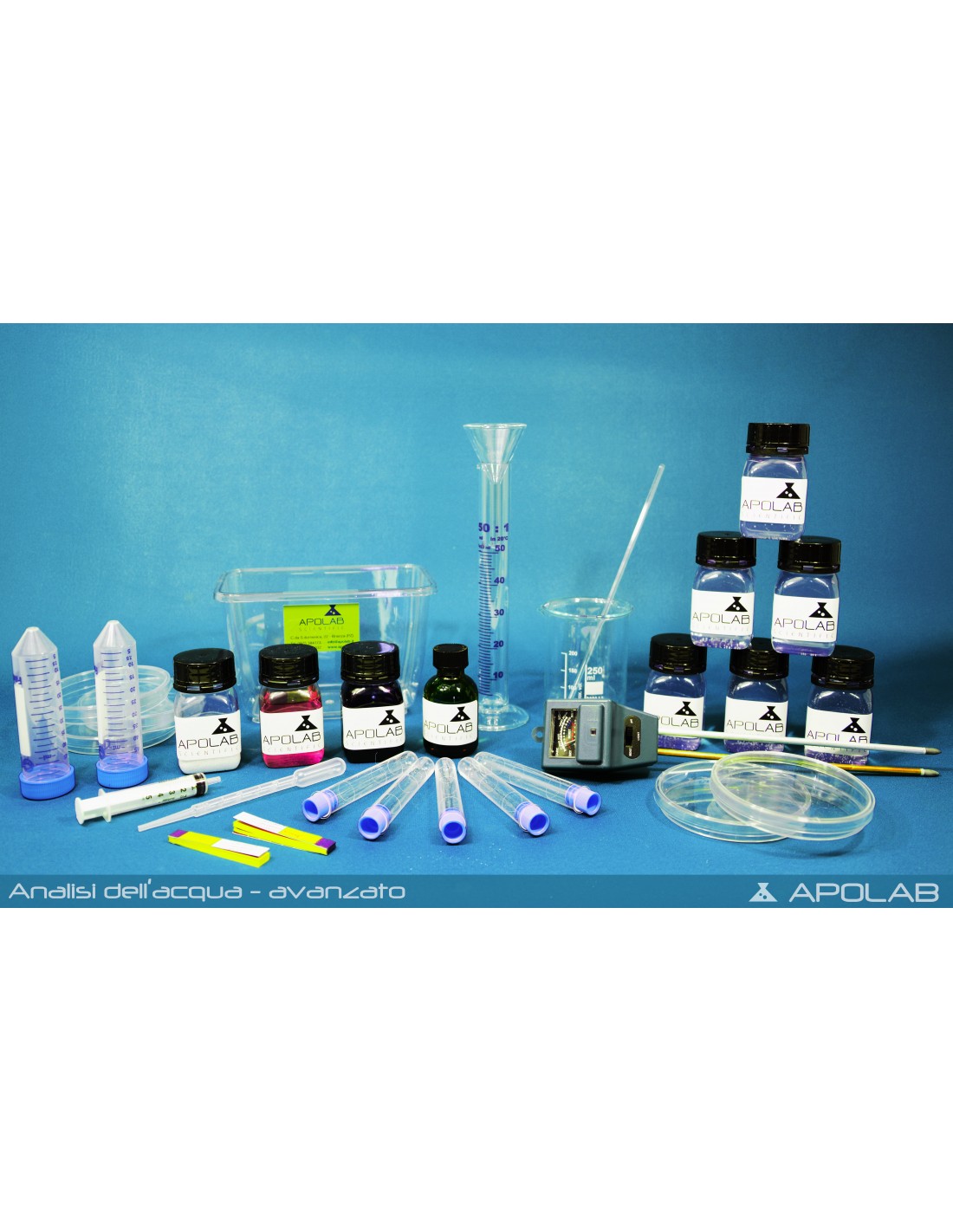 1 imbuto - 1 cilindro graduato - 1 becher 250ml - 5 provette con tappo - 1 pipetta pasteur - 1 siringa - 1 acquario - 1 bacchetta per agitazione - 5 capsule petri - 2 raccoglitori di acque - 1 cartina indicatrice ph - 1 phmetro1 Phmetro, cartine indicatrici PH reagenti necessari alle esperienze in flaconi da 25/50ml e manuale docente.