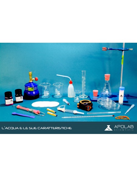 becher, siringhe, imbuto di vetro, pipetta pasteur, cartoncino A4, metro a rotella, portacandela, carta da filtro, confezione di terriccio, spatola, palloncino, bottiglietta di plastica, pallina da ping-pong, foglio bianco, pinzetta, termometri da ambiente, provetta con tappo, tubicino flessibile in gomma, palloncino, foglio di cartoncino, tubo di vetro o PVC 40cm, candela, vaschetta di alluminio, beute, conf. di semi di erba, rotolo di nastro adesivo, bruciatore a gas, filo di cotone, 1 tubicino di vetro, 1 gomma da matita, mascherina, barattolo, reagenti necessari alle esprienze in flaconi da 25/50 ml