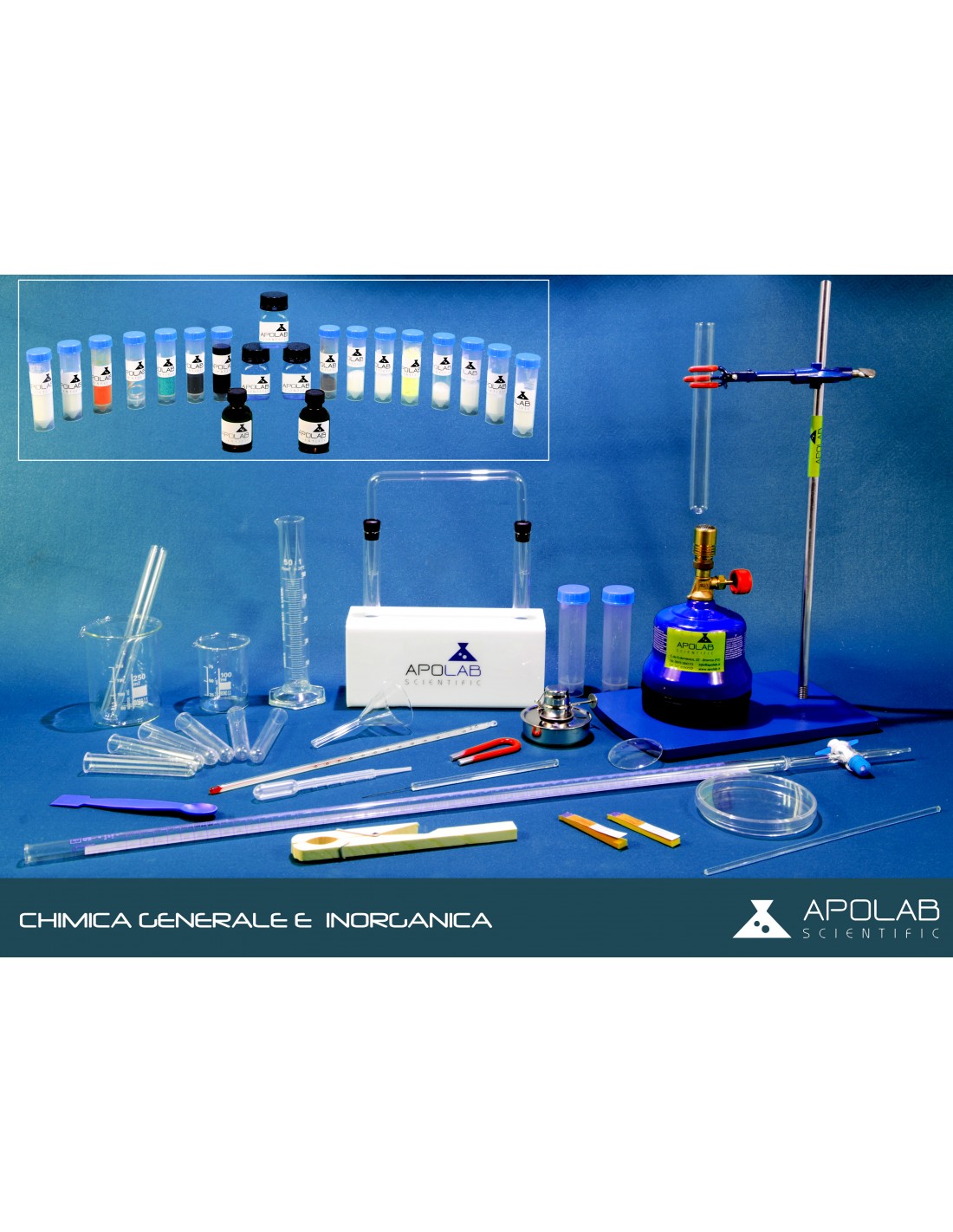 tubo ad U simmetrico con tappi, calamita, spatola flessibile, cartina tornasole neutra, termometro da ebollizione, provette, bacchetta per agitazione, pinza di legno, asta metallica, base per asta, bacchetta con filo Ni-Cr, imbuto, flaconi vuoti, morsetto, pipetta pasteur, cilindro graduato, provetta, capsula petri, reagenti necessari alle esperienze e manuale docente.