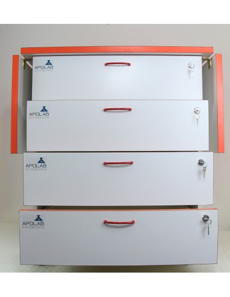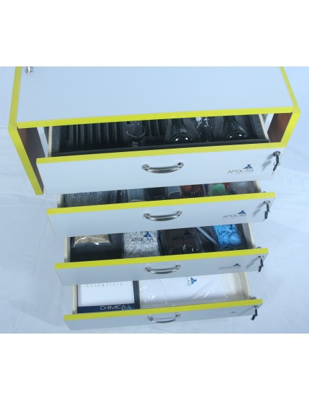 - Struttura in nobilitato melamminico, con 4 cassetti scorrevoli su guide metalliche con cuscinetti a sfera e con idoneo alloggiamento strumentazione mediante l'utilizzo di contenitori. Verniciatura con polveri epossidiche al alta temperatura.
